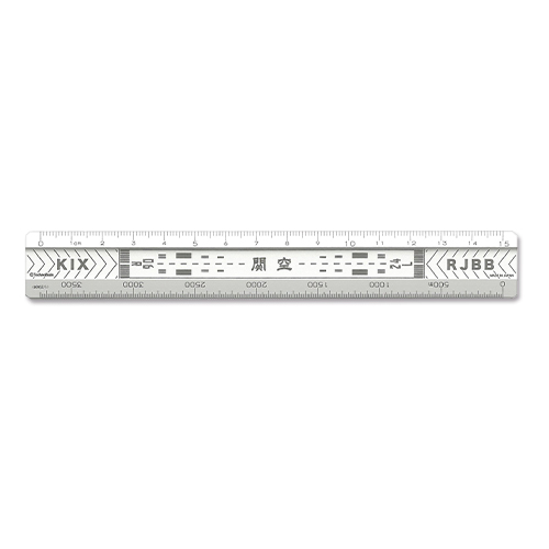 目盛りは、一般的な定規と同じ長さを図る為の『cm目盛り』と、地図や航空図を読むのに便利な『1/25000縮尺目盛り』の2種類を印字。